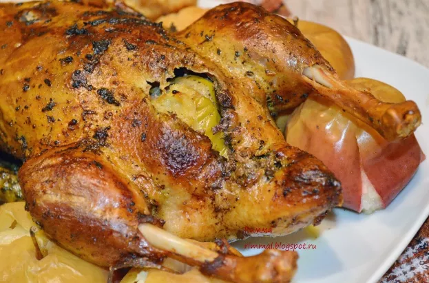 Rinse the duck, rub inside and out with salt, pepper, garlic. Prepare the filling - peel the apples of seeds, cut into slices. You can add washed prunes. Stuff the duck, sew up the hole in the abdomen with a strong thread. In this form, put it on a baking sheet with the back down, pour in a little water, put in a cold oven so that the heat rises gradually. Fry for 2 - 3 hours, sprinkling with liquid often from a baking sheet. When the duck is fried, sprinkle it with cold water (the crust will crunch better) and remove from the oven.