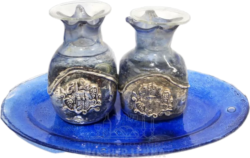 A pair of pomegranate-shaped candlesticks, made of silver-plated glass, blue, handmade