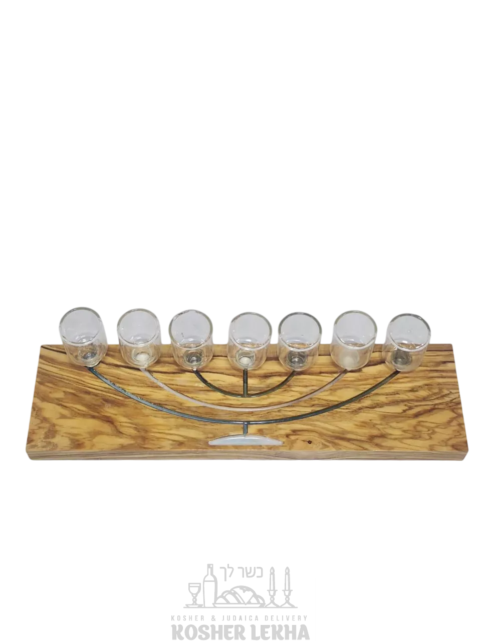 A wooden seven-candle holder with a large menorah painted on it