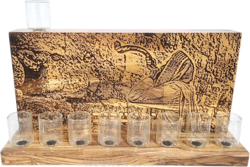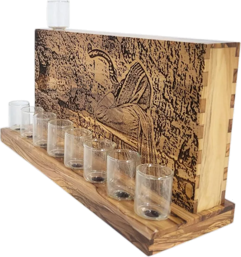 Hanukkah made of olive wood with a pattern of a priest blowing a shofar, handmade