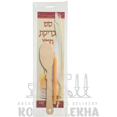 Set For "bedikat Chometz": Wooden Dust Pan, Beeswax Candle And Feather