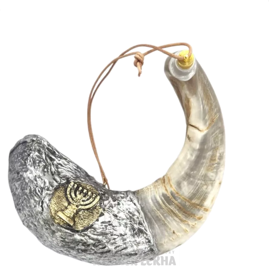 Shofar ram for anointing oil, silver and gold plated, with a menorah pattern , handmade