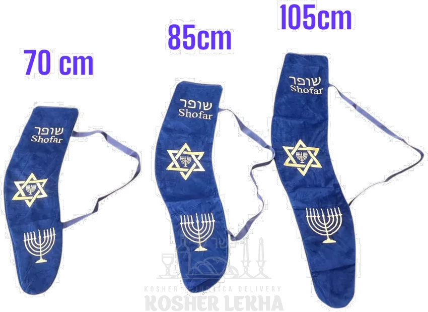 Embroidered shofar bag with a menorah and Star David pattern and the word shofar in Hebrew