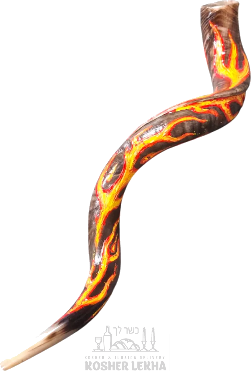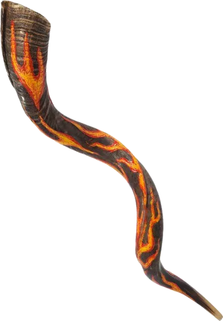 Shofar with a drawing of flames with the Hebrew letter ש for the name of God