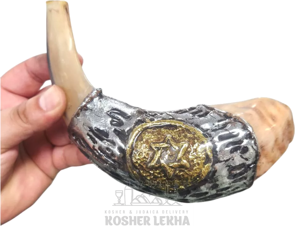 Shofar ram, plated with silver and gold, with Star of David pattern