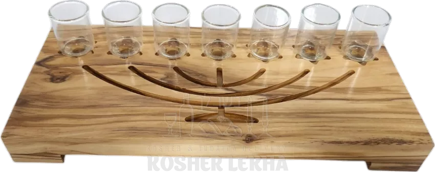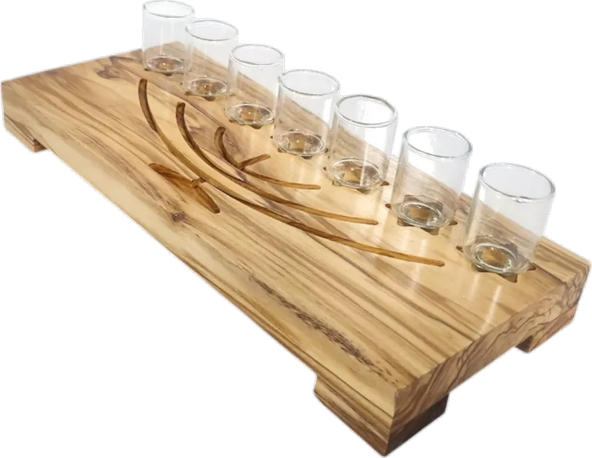 Olive wood menorah, with a menorah engraving and glass cups, handmade