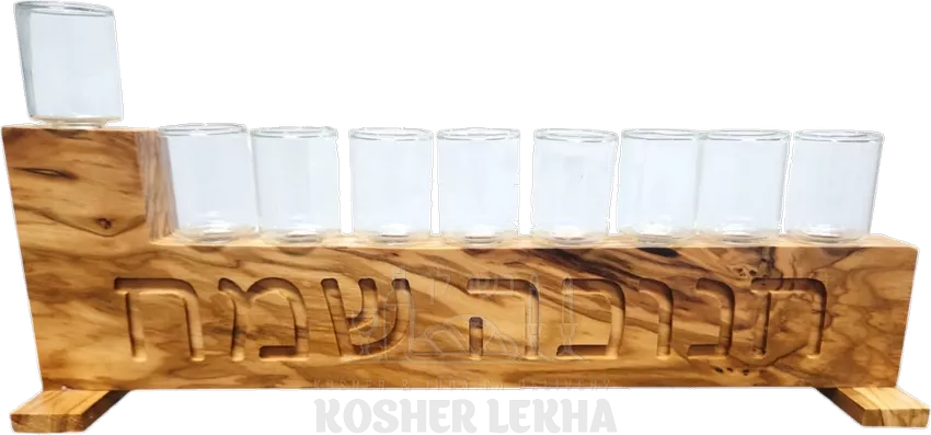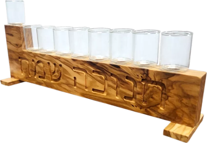Hanukkah menorah made of olive wood and glass cups with the inscription "Happy Hanukkah"
