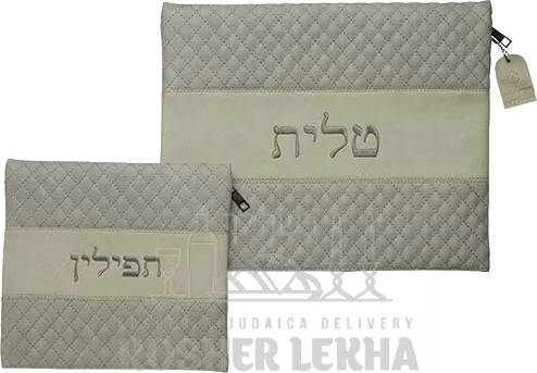 Set for talit and tefillin leather grey with beige stripe