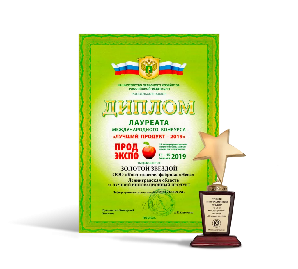 The trademark "DONI ZEFIRONI" of the Neva confectionery factory is a leader in the production of marshmallows and light sweets in the North–Western region and one of the largest confectionery enterprises in Russia.